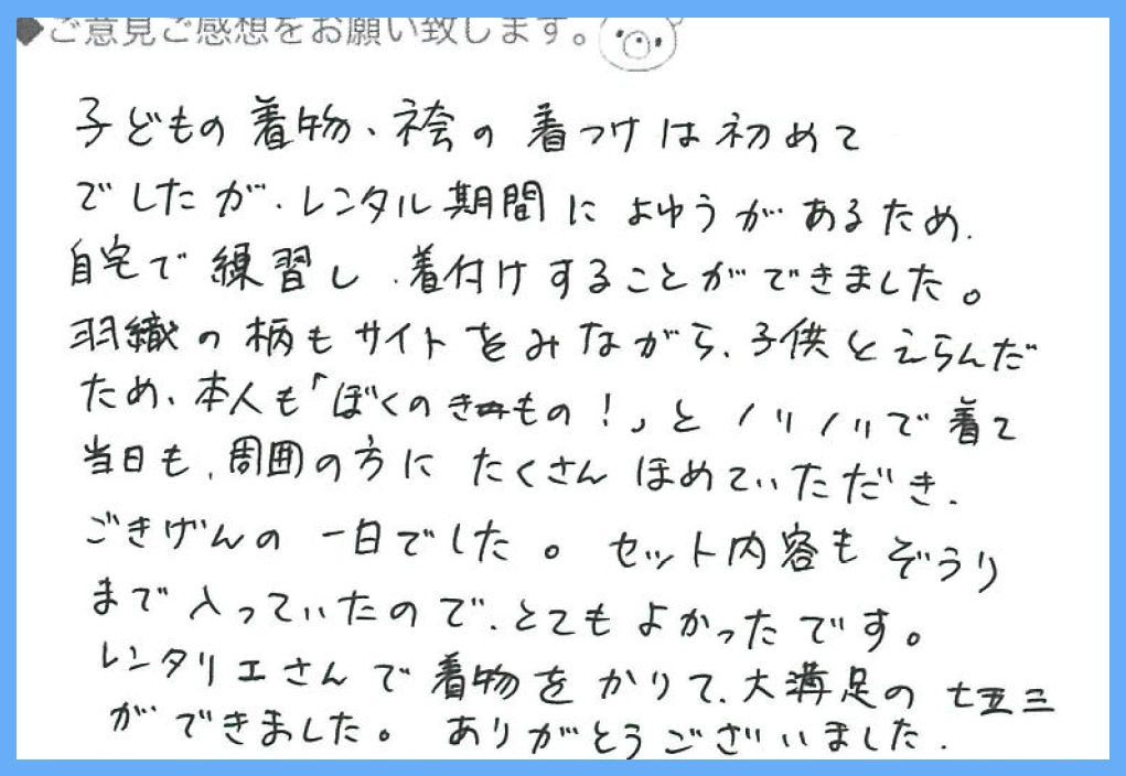 羽織の柄もサイトをみながら子供とえらんだため、本人も「ぼくのきもの!」とノリノリで着て、当日も周囲の方にたくさんほめていただき、ごきげんの一日でした。セット内容もぞうりまで入っていたので、とてもよかったです。
