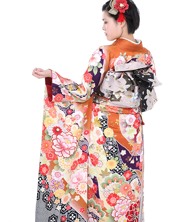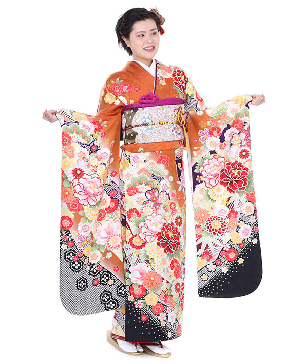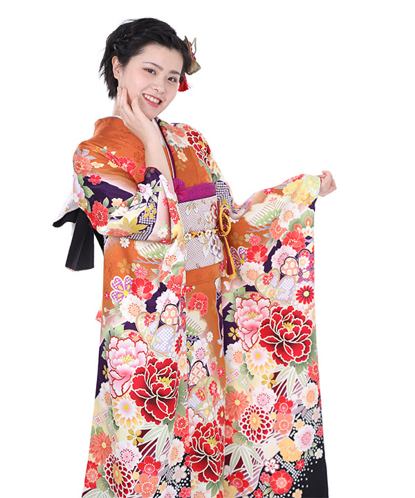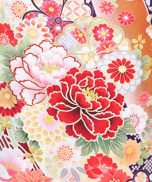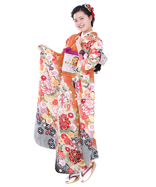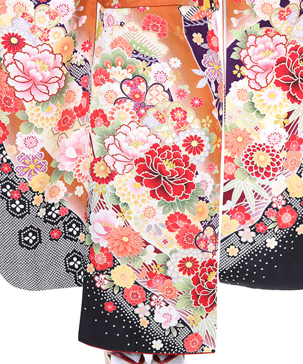 振袖|オレンジ色に牡丹と桜|F0008 L