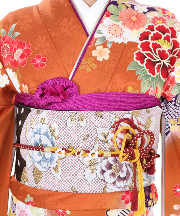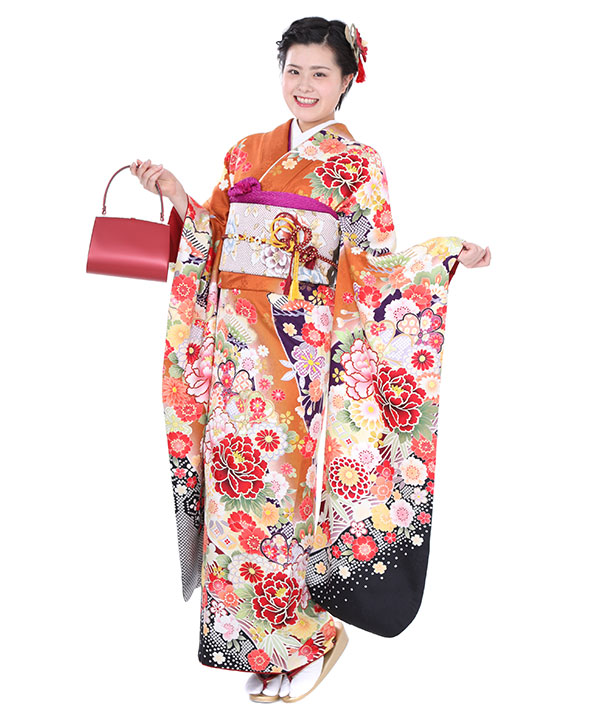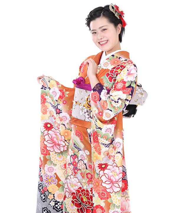 【振袖レンタル21点フルセット】振袖・袋帯・帯揚げ・帯締め・伊達衿は写真通りのコーディネートでお届け致します。濃いオレンジ色の地に牡丹や桜といった花模様が柄付けされた豪華な振袖です。帯も花模様で全体の統一感を出しました。