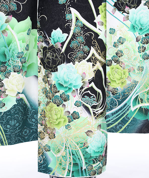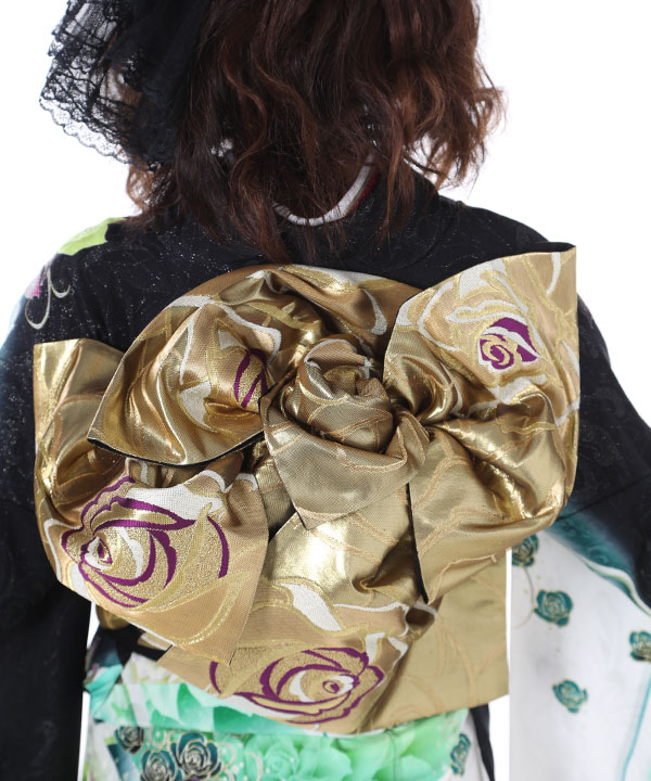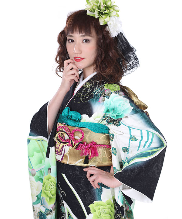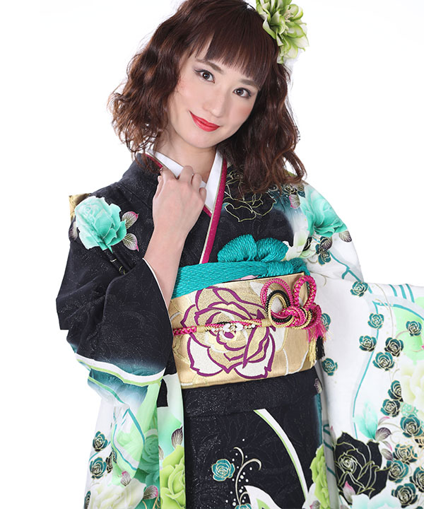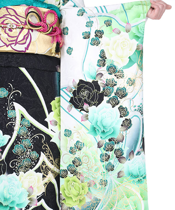 【振袖レンタル21点フルセット】振袖・袋帯・帯揚げ・帯締め・伊達衿は写真通りのコーディネートでお届け致します。黒に銀糸のキラキラで花やつたの地紋が浮き上がって見え、立体感があります。白や緑で染め分けられ、とても映える配色です。柄の大きなバラやゴールドの蝶に合わせ帯もゴールドのバラのみの柄であわせモダンな雰囲気に仕上がっています。