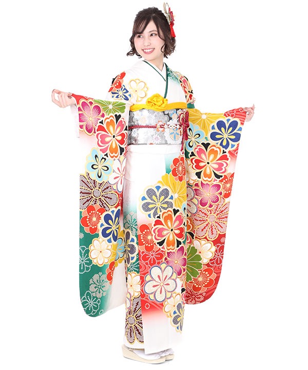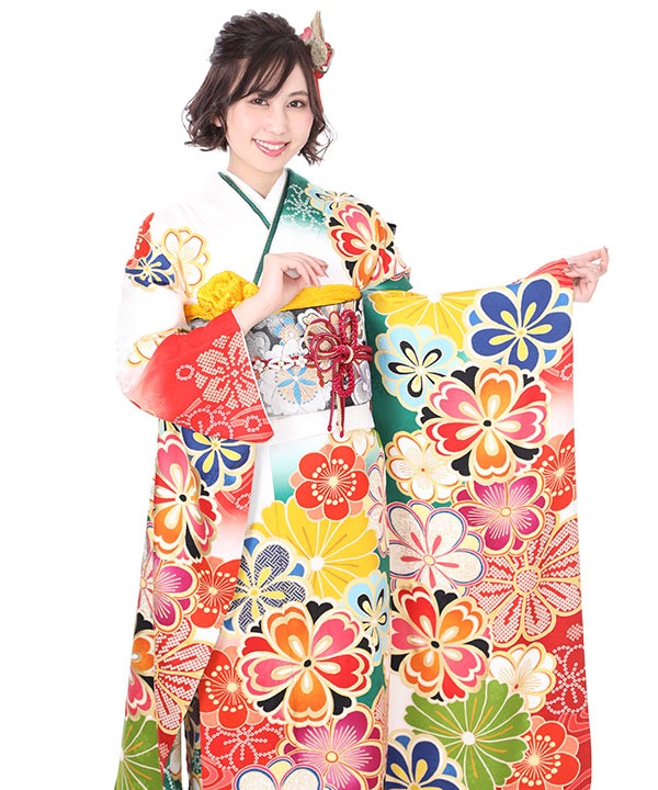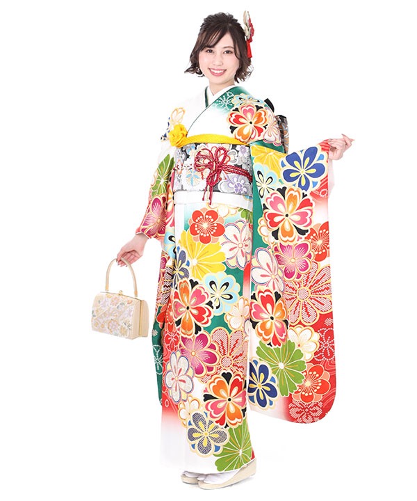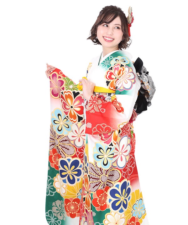 【振袖レンタル21点フルセット】振袖・袋帯・帯揚げ・帯締め・伊達衿は写真通りのコーディネートでお届け致します。白を基調に、オレンジや緑が所々にポイントで入った地色に、意匠化された桜や菊、梅、流水が踊るように描かれた現代らしいクールで可愛らしい振袖です。帯は黒に桜や雪輪が入った袋帯を合わせ、帯締めは臙脂にパールの飾りがポイントのものをあわせ、帯揚げはオレンジがかった黄色、伊達襟は振袖のポイントカラーとおそろいの深い緑色を合わせてスッキリとしたお顔まわりになるようにコーディネートされています。爽やかで好印象の一着です。