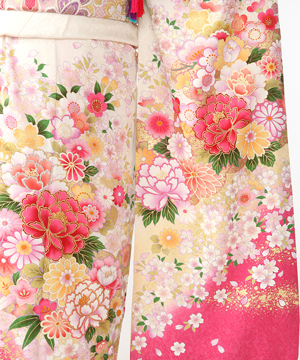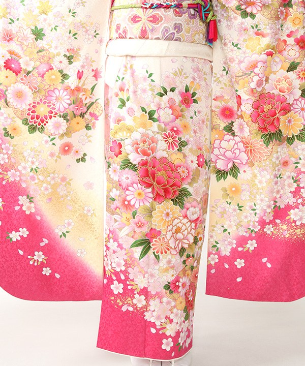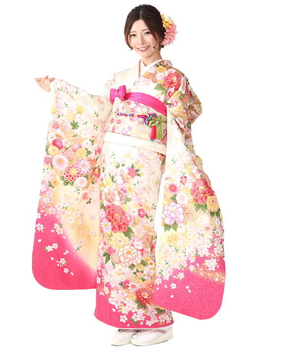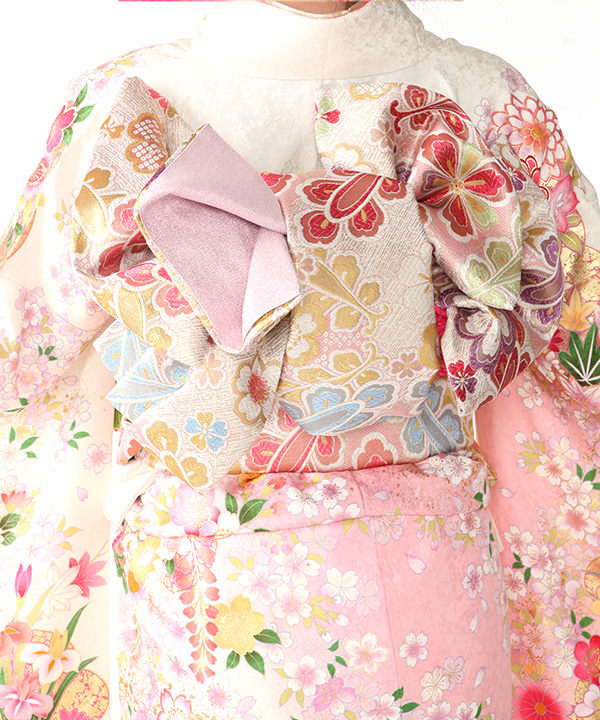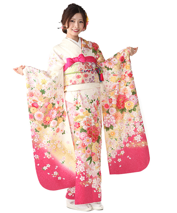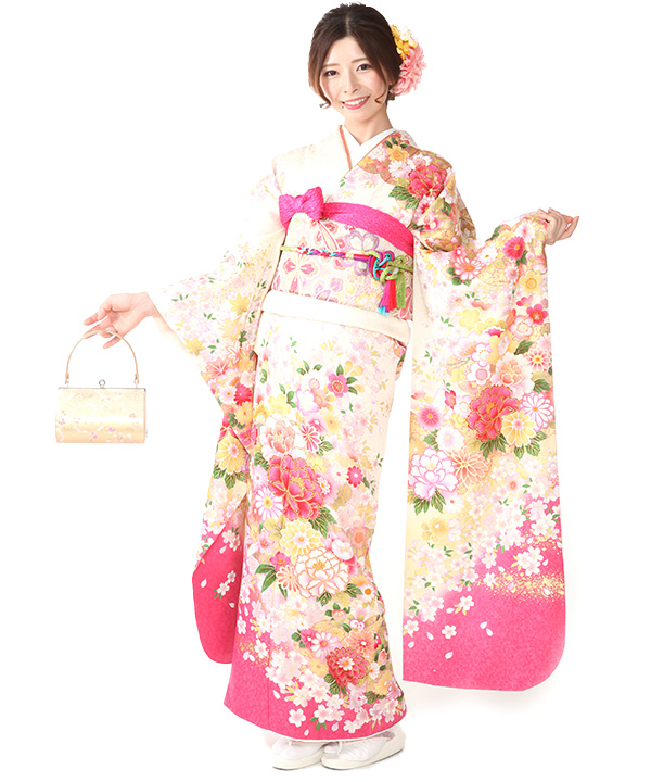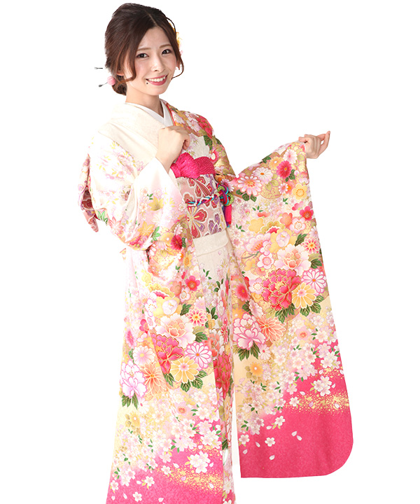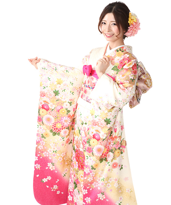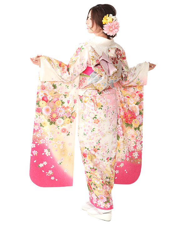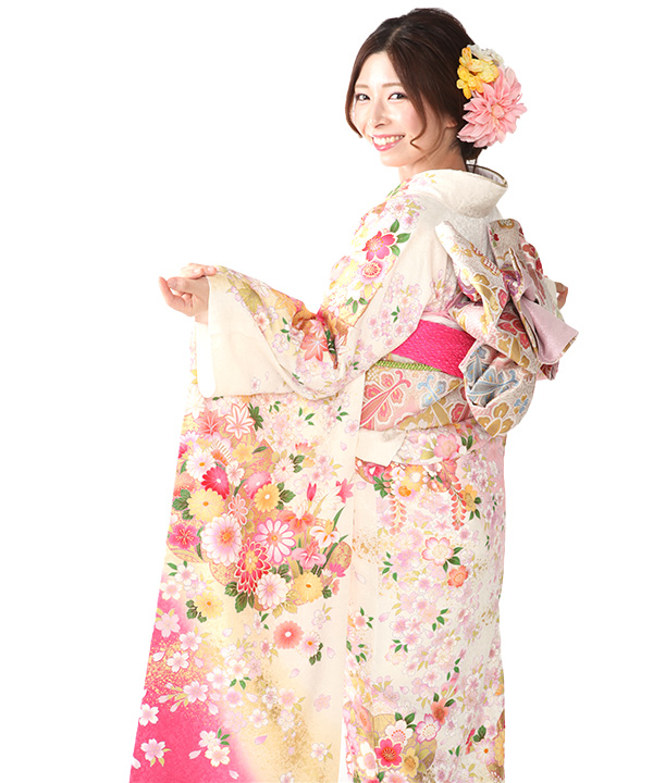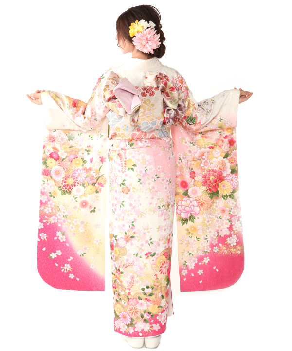 【振袖レンタル21点フルセット】振袖・袋帯・帯揚げ・帯締め・伊達衿は写真通りのコーディネートでお届け致します。優しい色味の白地に裾に向かってピンクのグラデーションの入った地色に桜、菊、桔梗、橘、松、梅、楓、杜若、藤など四季の花々が繊細で柔らかなタッチで描かれた華やかなフェミニンな美しさのある振袖です。帯は振袖と同系色の白地にパステルカラーの入った袋帯に、帯締めは若草色にカラフルな飾り紐のついたもの、帯揚げは躑躅色、伊達襟は桃色を合わせました。可愛らしさと大人っぽさを併せ持った、非常に素敵なコーディネートになっています。成人式はもちろん、結納などにもおすすめです。
