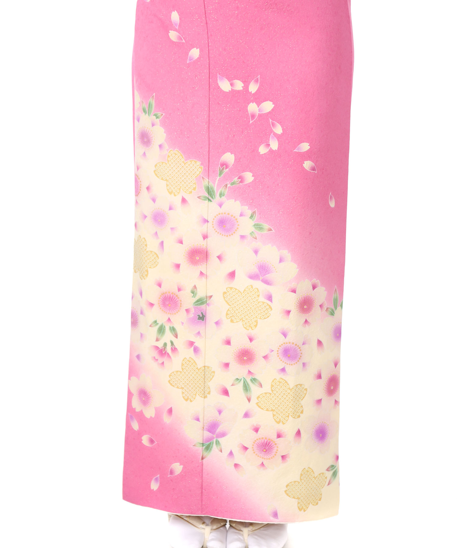 【訪問着レンタル19点フルセット】訪問着・袋帯・帯揚げ・帯締めは写真通りのコーディネートでお届け致します。 ラメの入ったピンク地に、裾にクリームのグラデーションと、八重桜が描かれた訪問着です。帯は着物にあわせてベージュに金の入った桜柄に、小物もピンク系でまとめ、若々しく爽やかなコーディネートです。