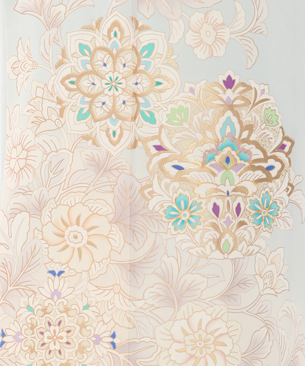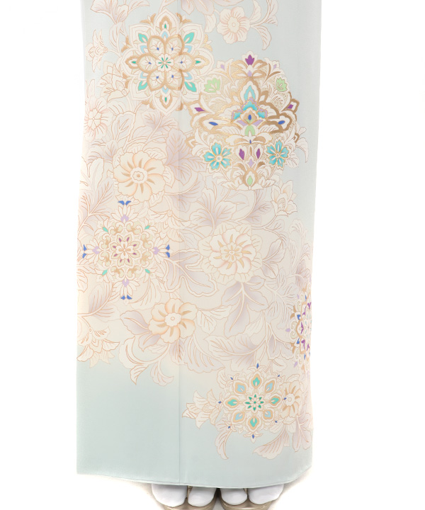 【訪問着レンタル19点フルセット】訪問着・袋帯・帯揚げ・帯締めは写真通りのコーディネートでお届け致します。薄白藍に白のぼかしが入った色合いで、唐花文様が描かれた訪問着です。
