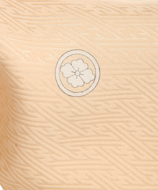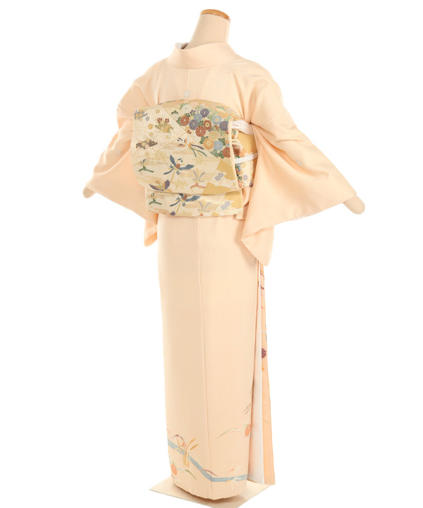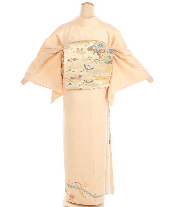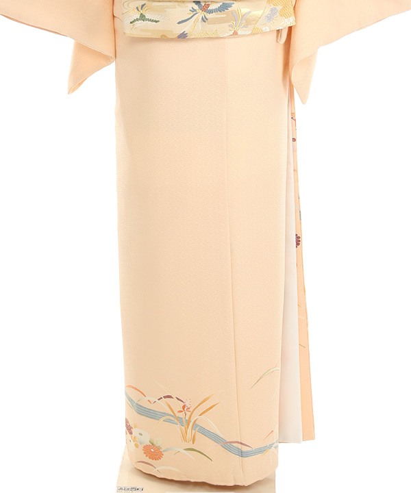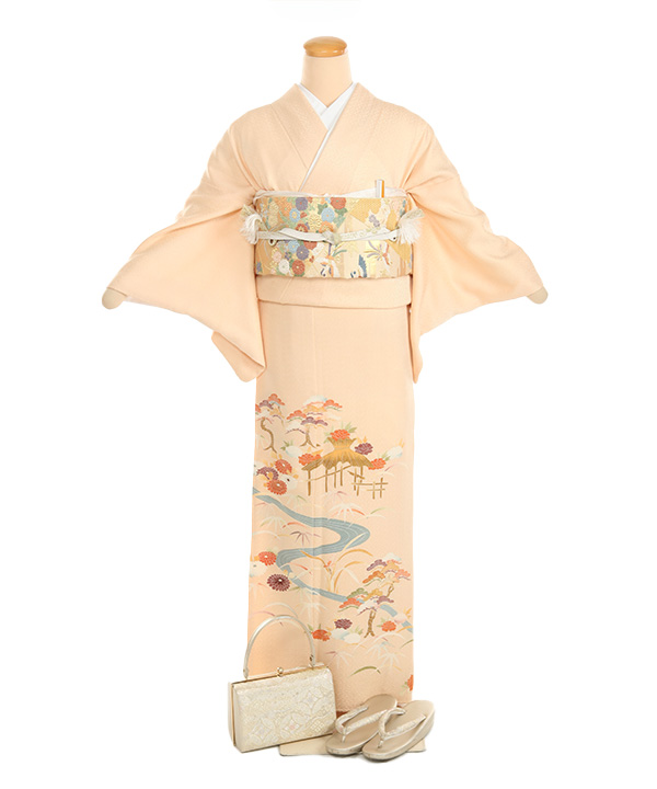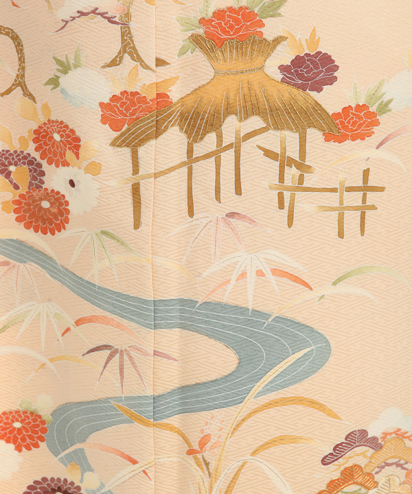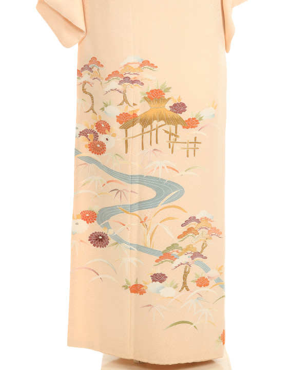 紗綾型の地模様がの入ったオレンジみがかったクリーム色地に流れる川に沿って、菊、松、笹、露芝、牡丹が描かれた優しい雰囲気の色留袖です。