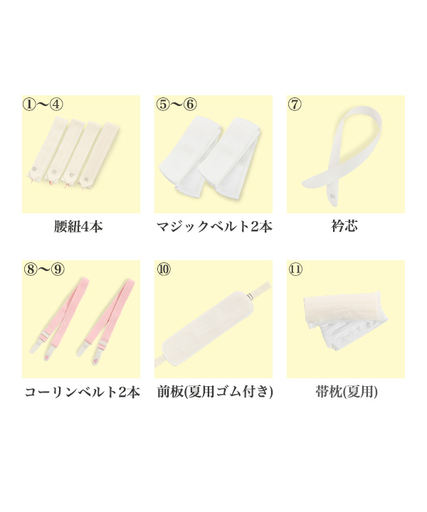 腰紐4本 / マジックベルト2本(メッシュタイプ) / 衿芯 / コーリンベルト(着付ベルト)2本/ 前板(ゴム付き) / 帯枕
