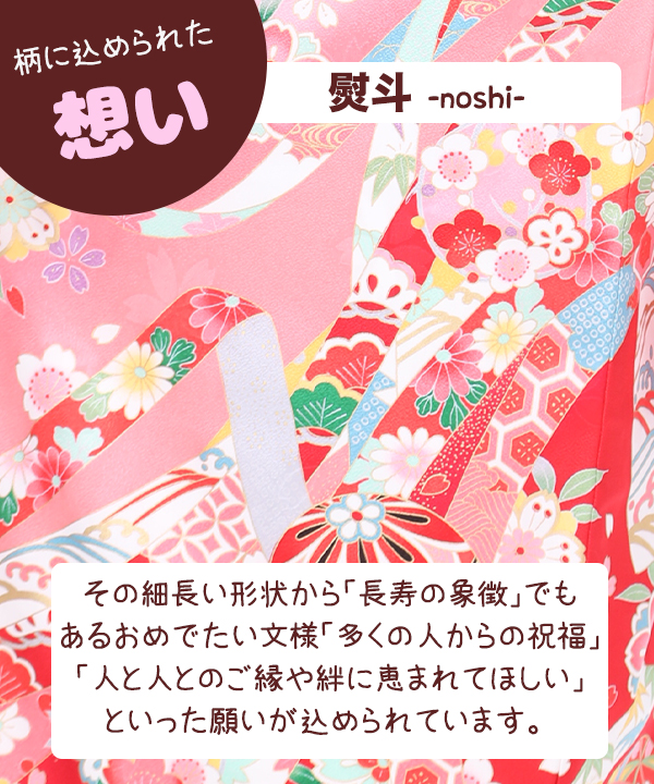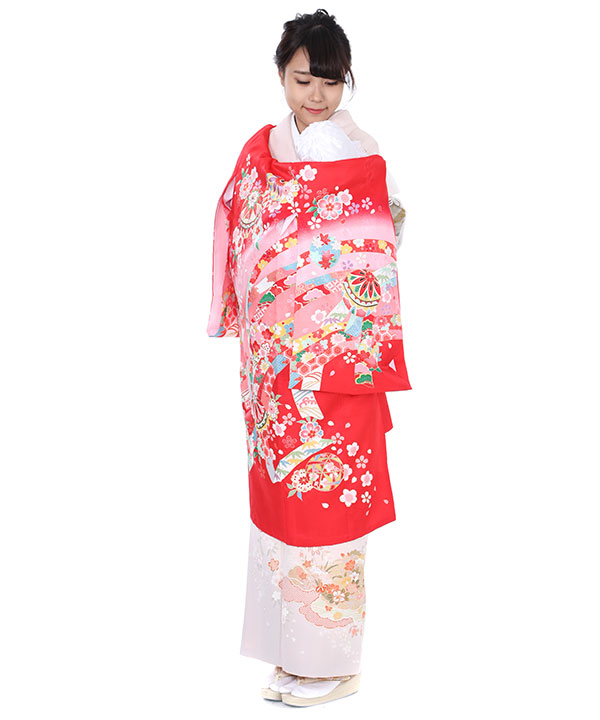 赤地にピンクのぼかしが入っています。熨斗が大きく柄付けされ、鞠や牡丹、菊、梅などか描かれた豪華な一枚になっています。