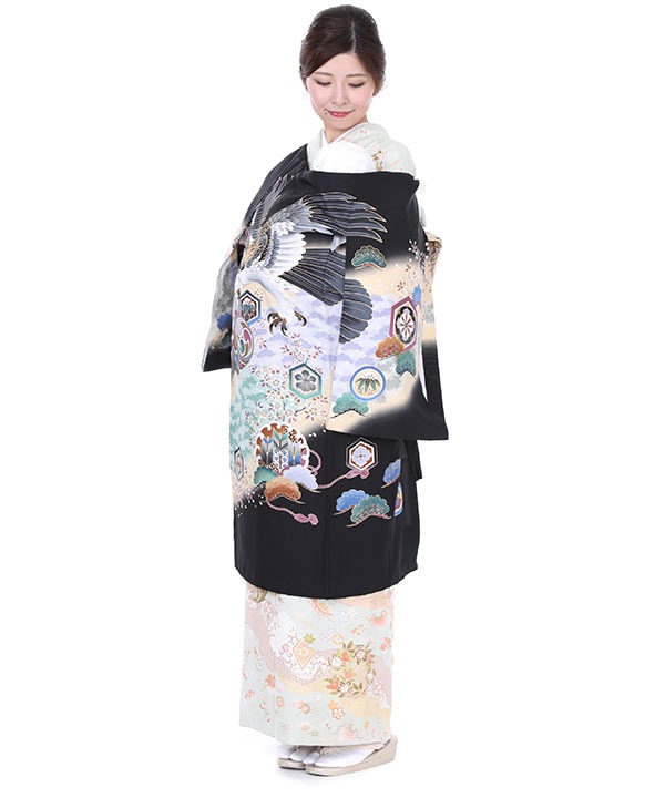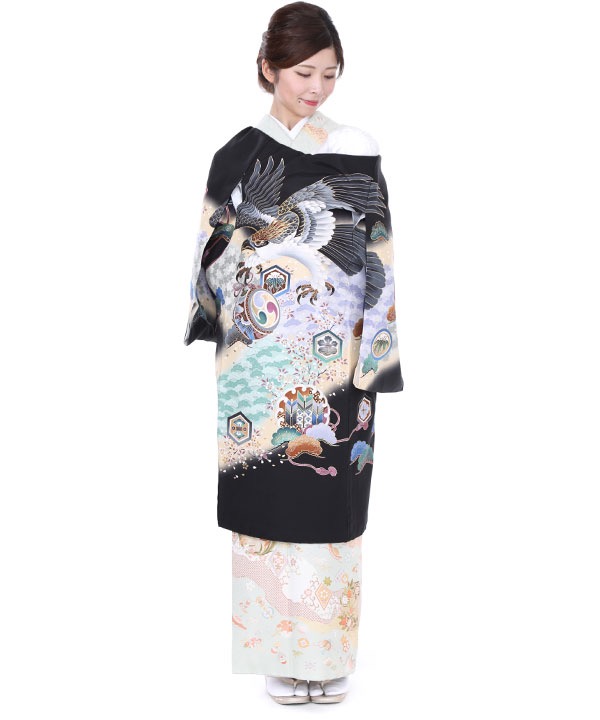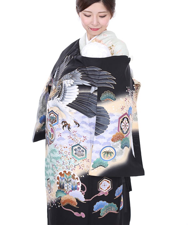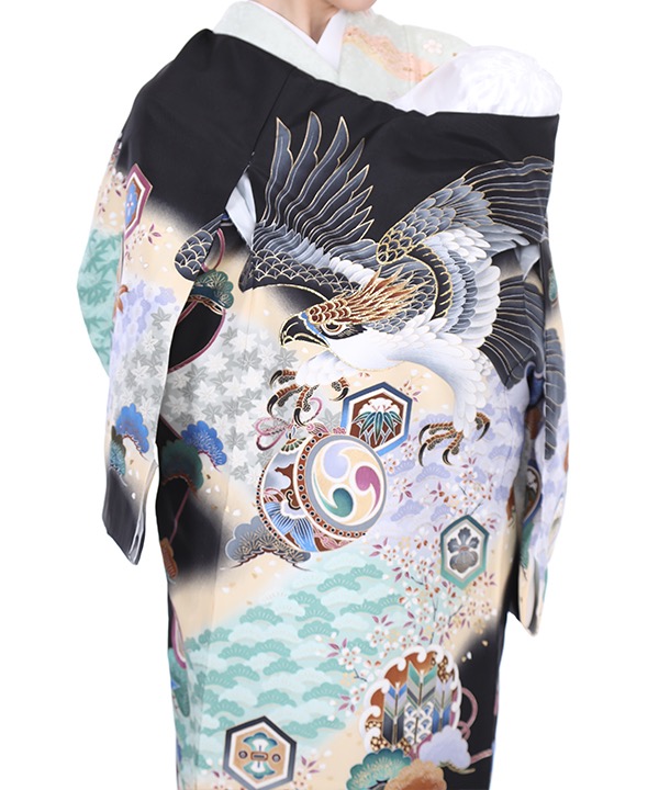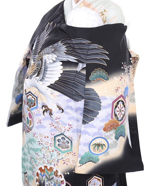 黒地にクリームのぼかしが入っています。着物全体に流れるように竹、梅、紅葉、松が柄付けされ、鷹や太鼓なども描かれています。