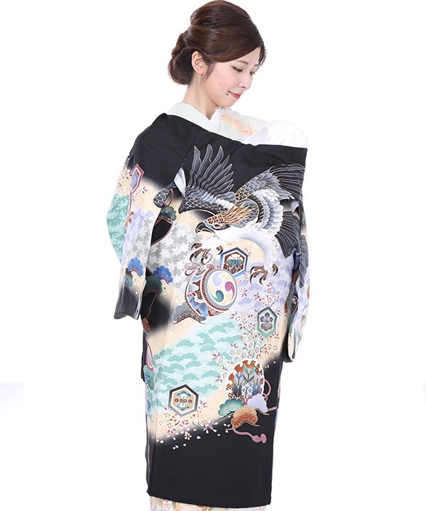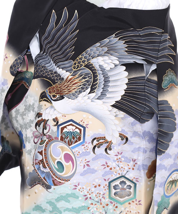 お宮参り産着|黒地に鷹と太鼓に山桜|U0058 男の子