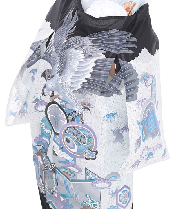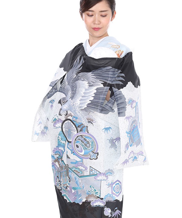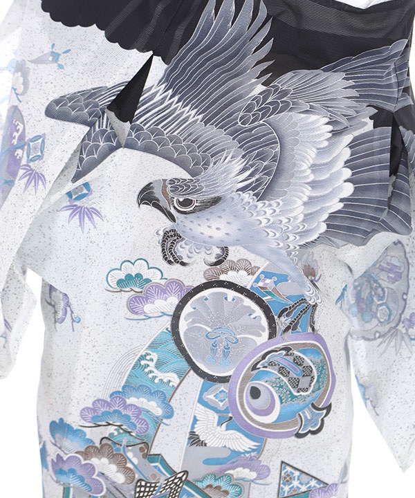 黒と灰色地に大きく描かれた鷹。打出の小槌、鼓、丁子、七宝のおめでたい柄もたくさん柄付されたモノトーンでクールな一枚です。