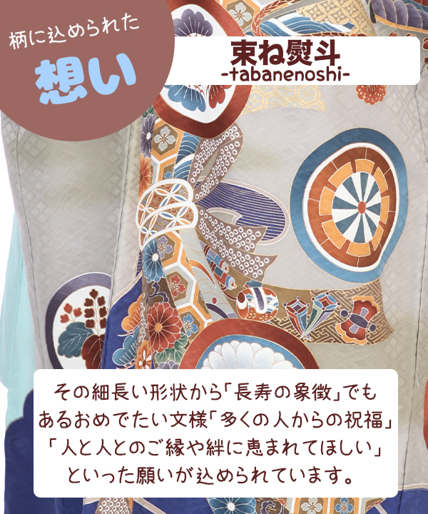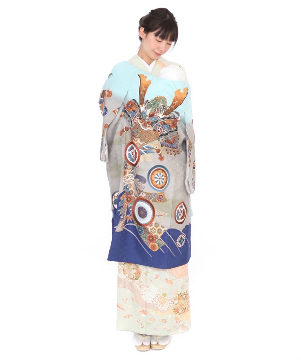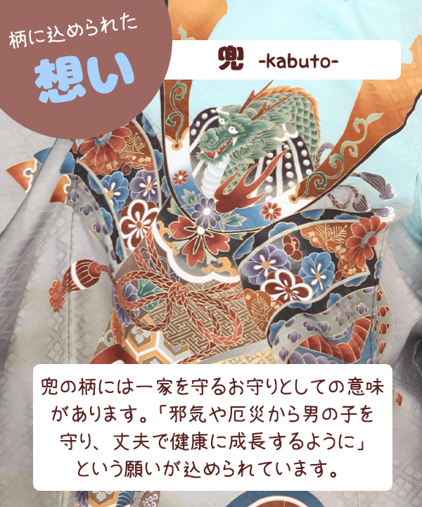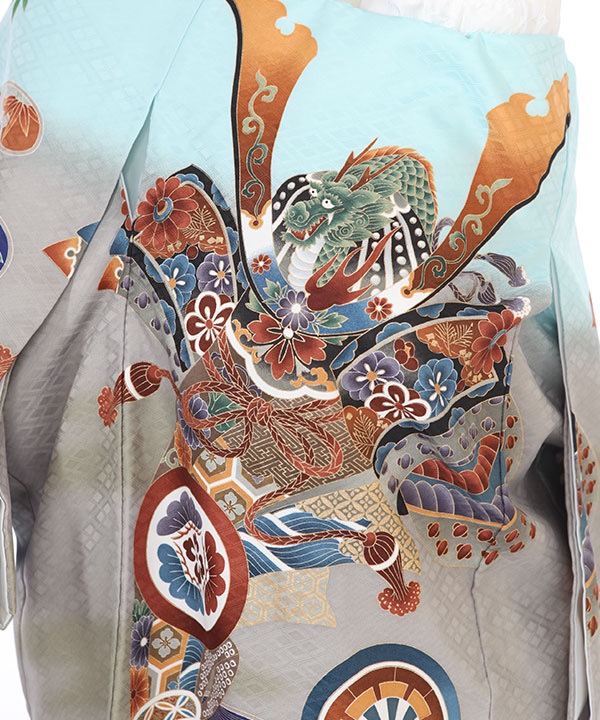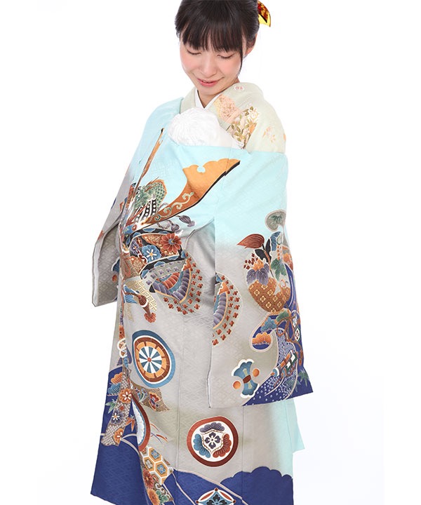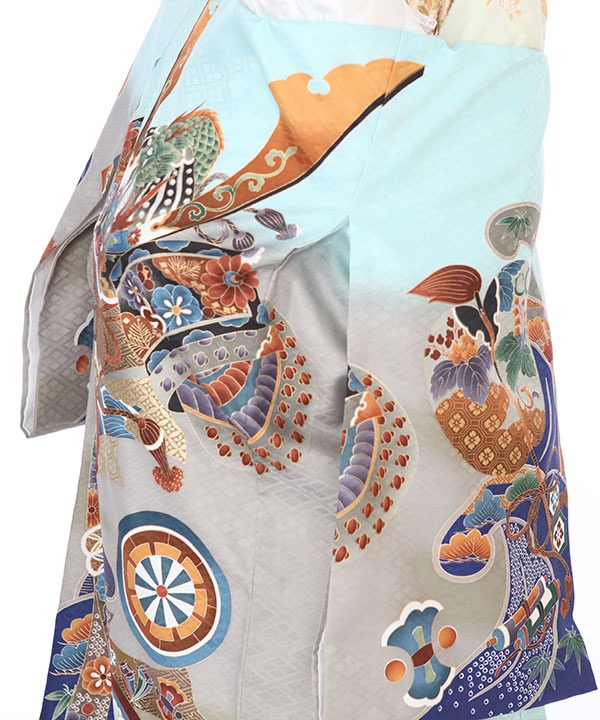 水色地にグレーのぼかしが入り、熨斗に大きな兜が描かれ、かっこいいデザインになっています。軍配や宝づくしなども柄付けされ大変おめでたい一枚です。