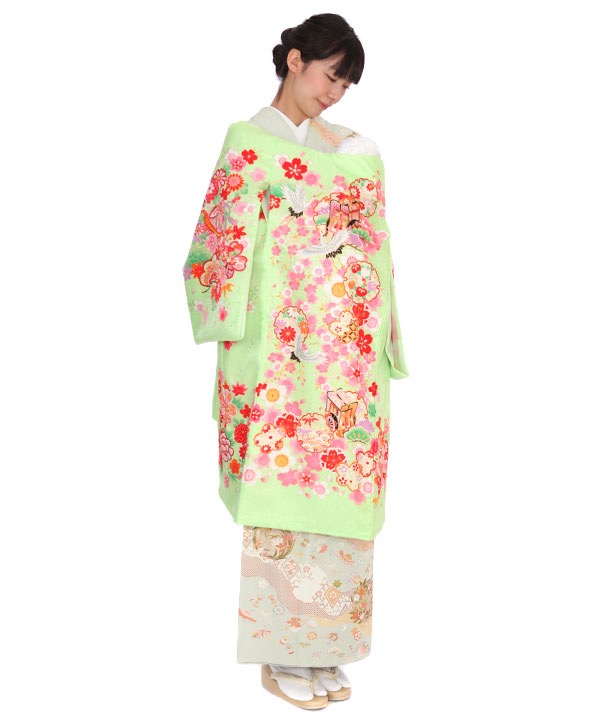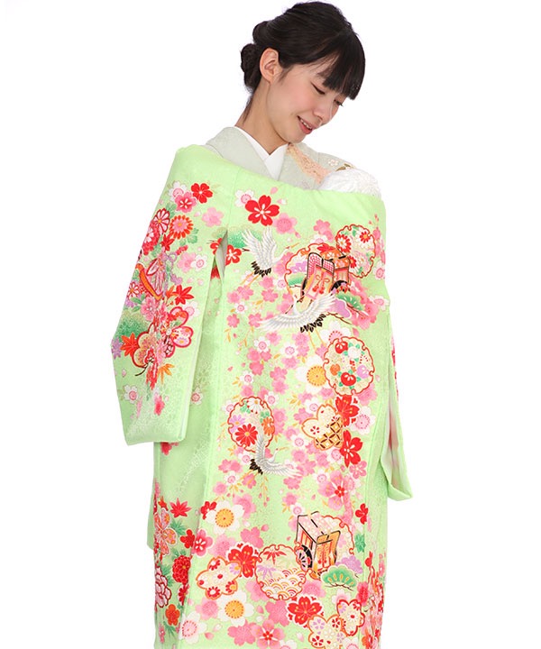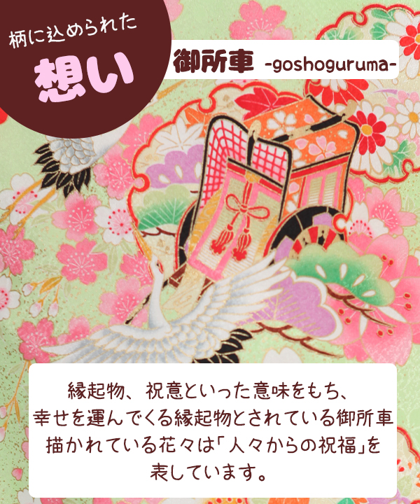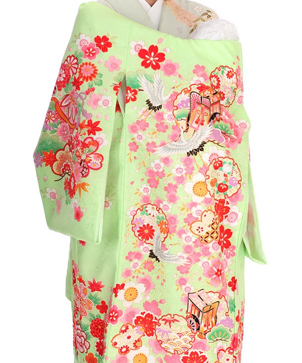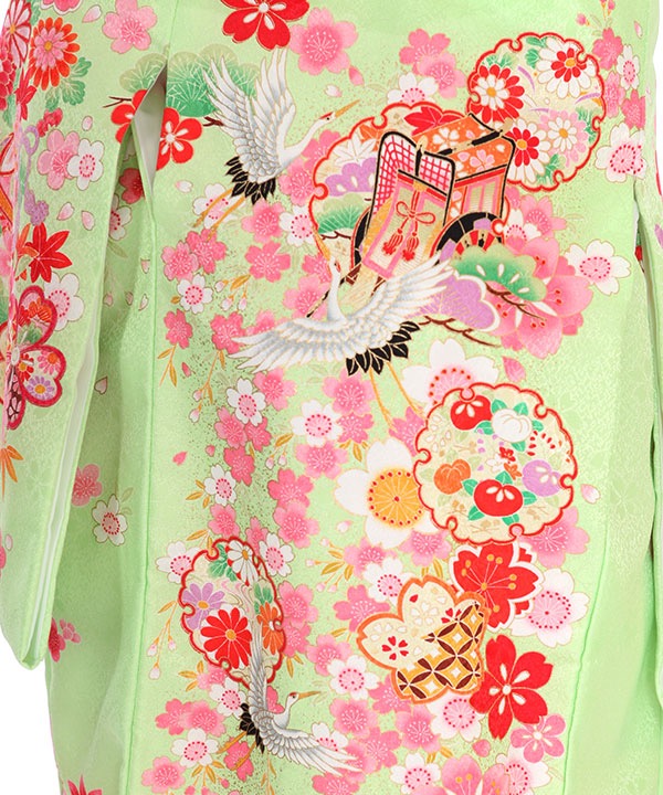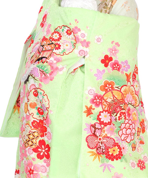お宮参り産着|黄緑地に鶴や御所車|U0131 女の子