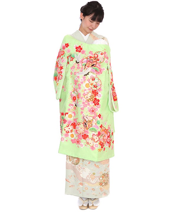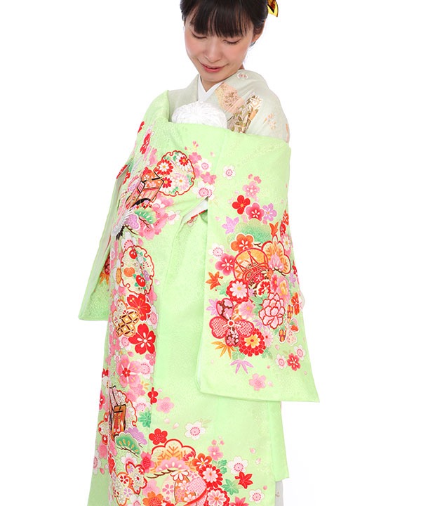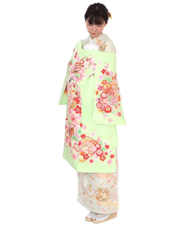 やや薄い黄緑地に流れるように桜や梅、多彩な花々や雪輪、鼓が柄付けされている大変華やかな一枚です。画像では分かりにくいかもしれませんが桜の地模様がとっても可愛らしい一枚です。