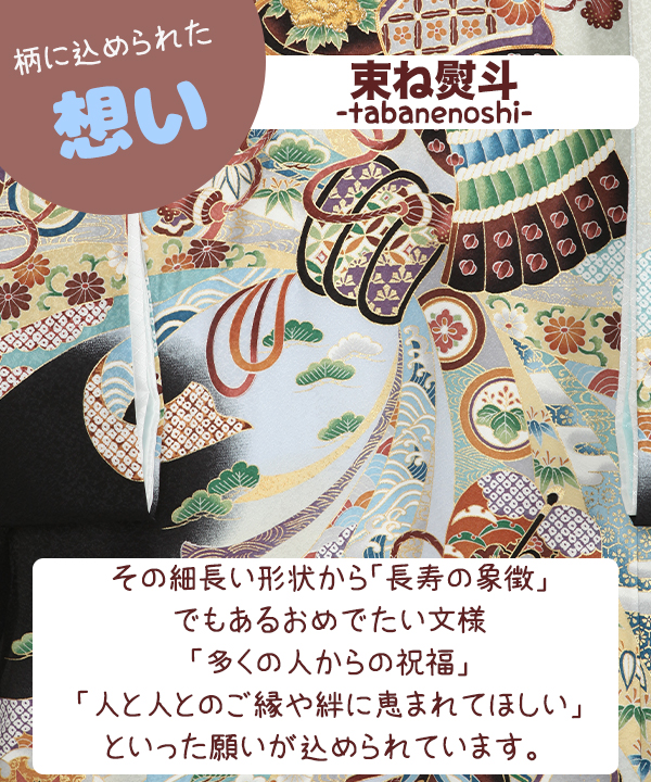 黒地に大きな勢いのある熨斗の上に兜や金嚢、分銅、軍配、鐙、弓などおめでたい柄が豪華に描かれた男の子産着です。兜には一部金刺繍が施されています。