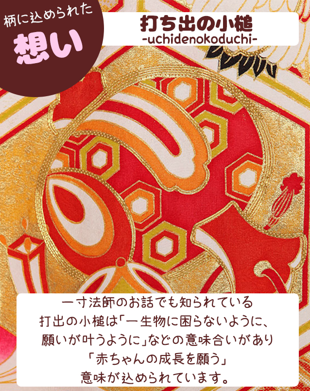 赤地に箔や金駒刺繍が施された向い鶴が印象的な一枚です。宝尽くしに花菱亀甲、松竹梅などおめでたい柄が描かれたお着物となっております。画像では伝わりにくい程の豪華で素敵な産着です。