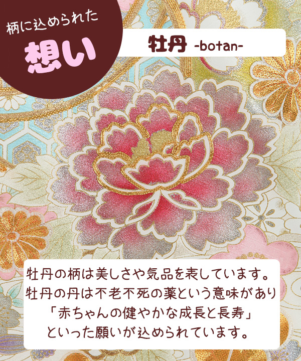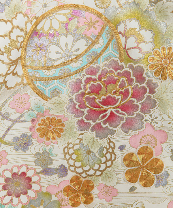 全体的に金彩が施され、鞠や花には金駒刺繍も施されております。優しい雰囲気かつ豪華な一枚です。梅や菊、桜には絶妙なグラデーションカラーとなっており丁寧に丁寧に染色されたお着物となっております。画像では伝わりにくい程の豪華で素敵な産着です。
