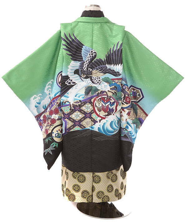 七五三(五歳)|鷹柄緑羽織 黒着物×ベージュ袴|W-B-5-106